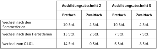 Der Wechsel in die Zweitfachrichtung findet in der Regel zum 1. Januar statt, ein früherer Beginn ist nach individueller Absprache möglich. In der folgenden Tabelle finden Sie die Übersicht der Stundenverteilung zwischen Erst- und Zweitfach, abhängig vom Zeitpunkt des Wechsels: