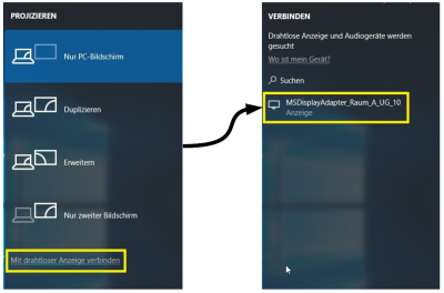 - Alle neueren Windows-Laptops lassen sich drahtlos über den in den Hörsälen installierten Wireless Display Adapter mit dem Beamer verbinden.