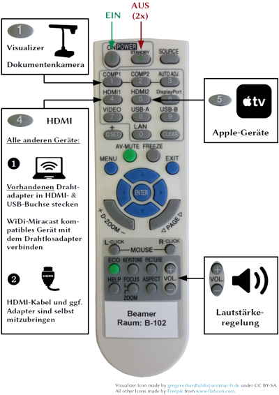 - Das Apple-TV erreicht man über die Taste HDMI2 auf der Beamer-Fernbedienung.