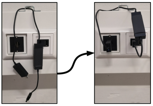 - Für die Verbindung mit dem Beamer steckt man als erstes den Drahtlos-Adapter in HDMI-Buchse und USB-Buchse im Kabelkanal