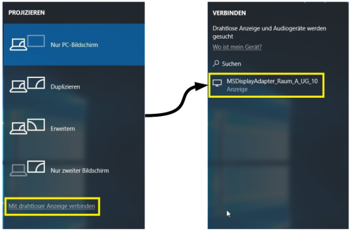 - Alle neueren Windows-Laptops lassen sich drahtlos über den in den Hörsälen installierten Wireless Display Adapter mit dem Beamer verbinden.